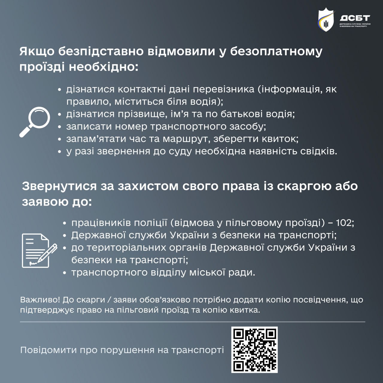 Нагадаємо, повідомити про порушення на транспорті можна за посиланням: https://complaint.dsbt.gov.ua/violation