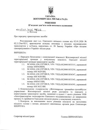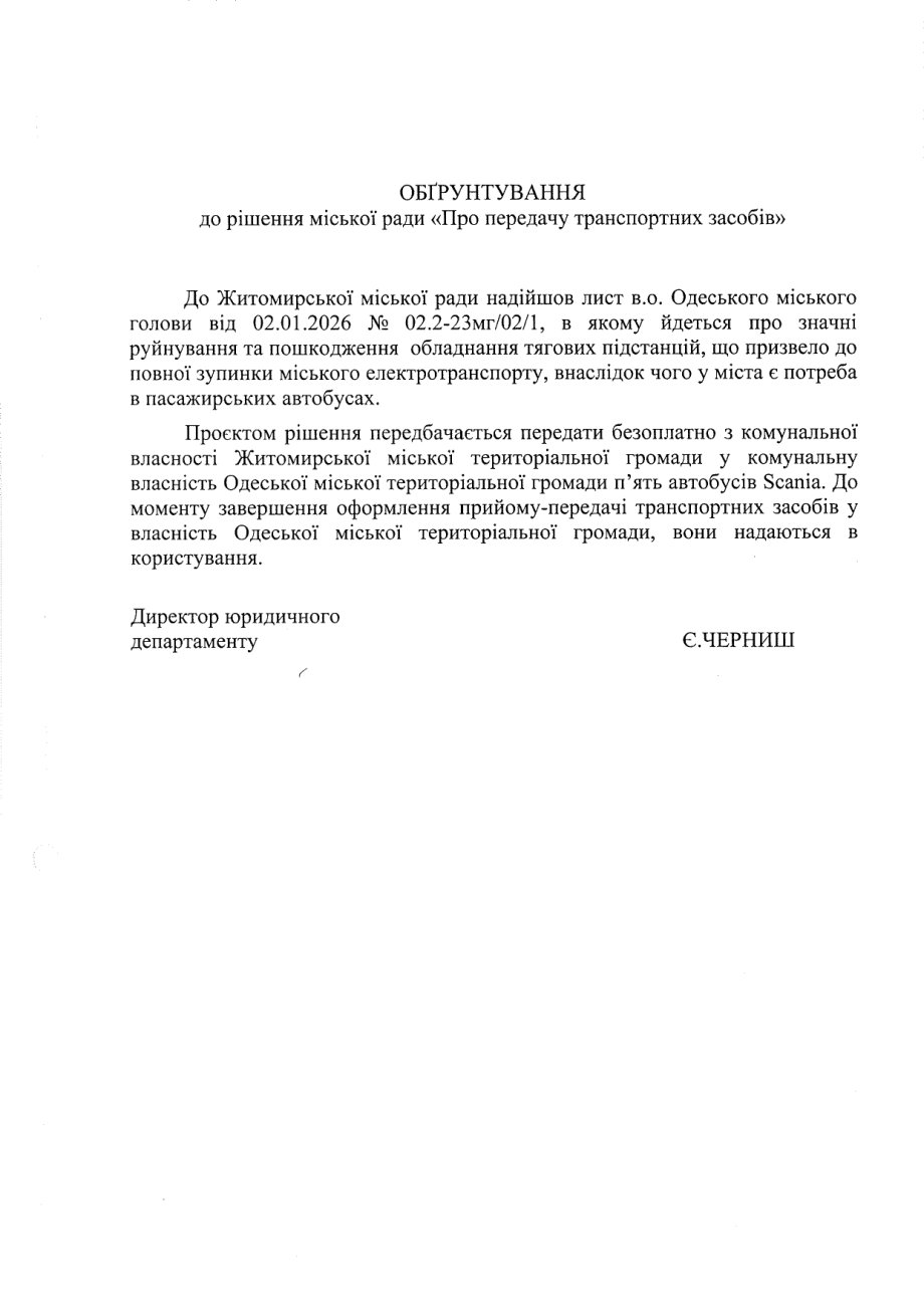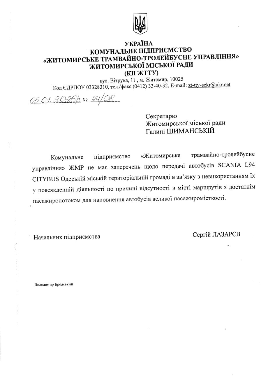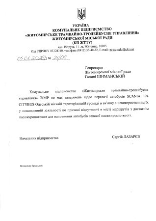 Водночас Житомир, на відміну від більшості міст, передає автобуси безповоротно у власність Одеської громади.