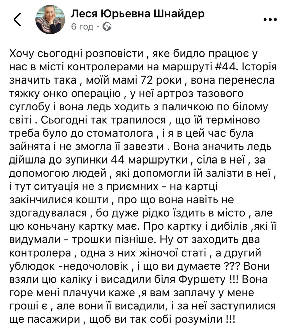10 лютого мешканка Житомира Леся Шнайдер опублікувала на своїй сторінці у соцмережі допис, у якому повідомила, що житомирські контролери нібито висадили з автобуса №44 її 72-річну онкохвору матір. У дописі також зазначалося, що після виходу з автобуса жінка впала та вдарилася головою об землю.