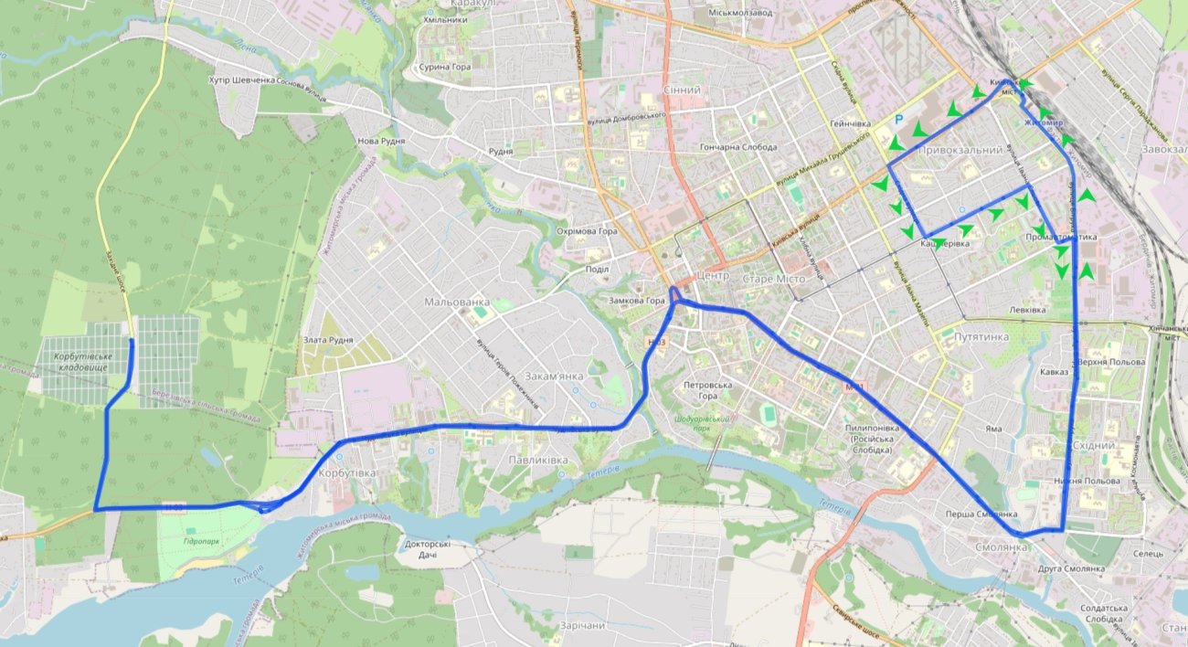 Нагадаємо, маршрут курсує через майдан Привокзальний та Автовокзал, а далі вулицями: Київська, Східна, Бориса Тена, Івана Сльоти, Вітрука, Велика Бердичівська, Леха Качинського, Чуднівська, Чуднівське та Західне шосе.