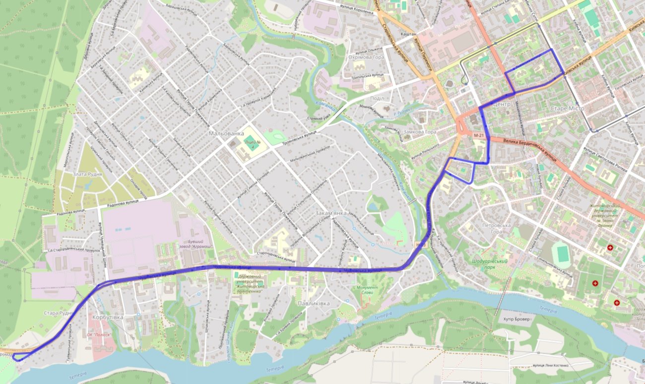 Тролейбус №15А курсуватиме за зміненим маршрутом: від центрального універмагу до Гідропарку (ЦУМ — вул. Київська — вул. Театральна — вул. Мала Бердичівська — вул. Леха Качинського — вул. Чуднівська — Гідропарк).