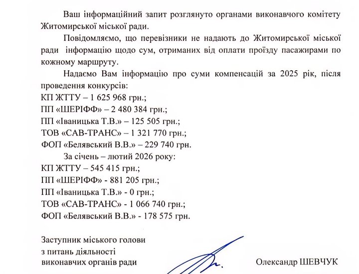“Повідомляємо, що перевізники не надають до Житомирської міської ради інформацію щодо сум, отриманих від оплати проїзду пасажирами по кожному маршруту”, — йдеться у відповіді міськради на запит.